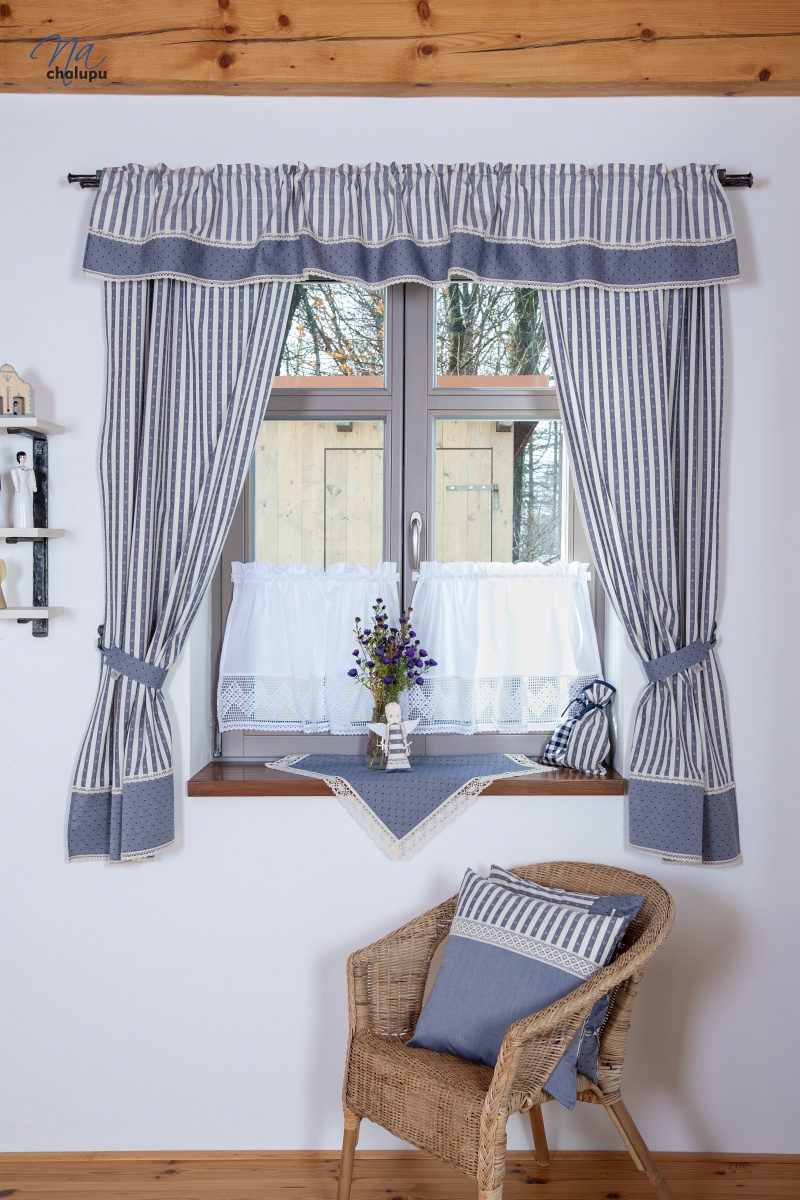 Tmavě modrá barva okno krásně orámuje, zjemní světlo a vytvoří příjemnou atmosféru. Závěsy se hodí do kuchyně, ložnice i obývacího pokoje a dobře ladí s bílými stěnami, dřevěným nábytkem i lněnými doplňky.
