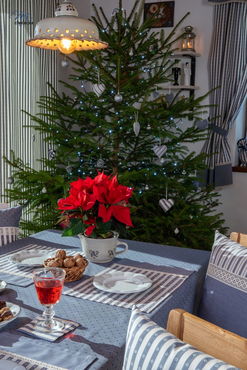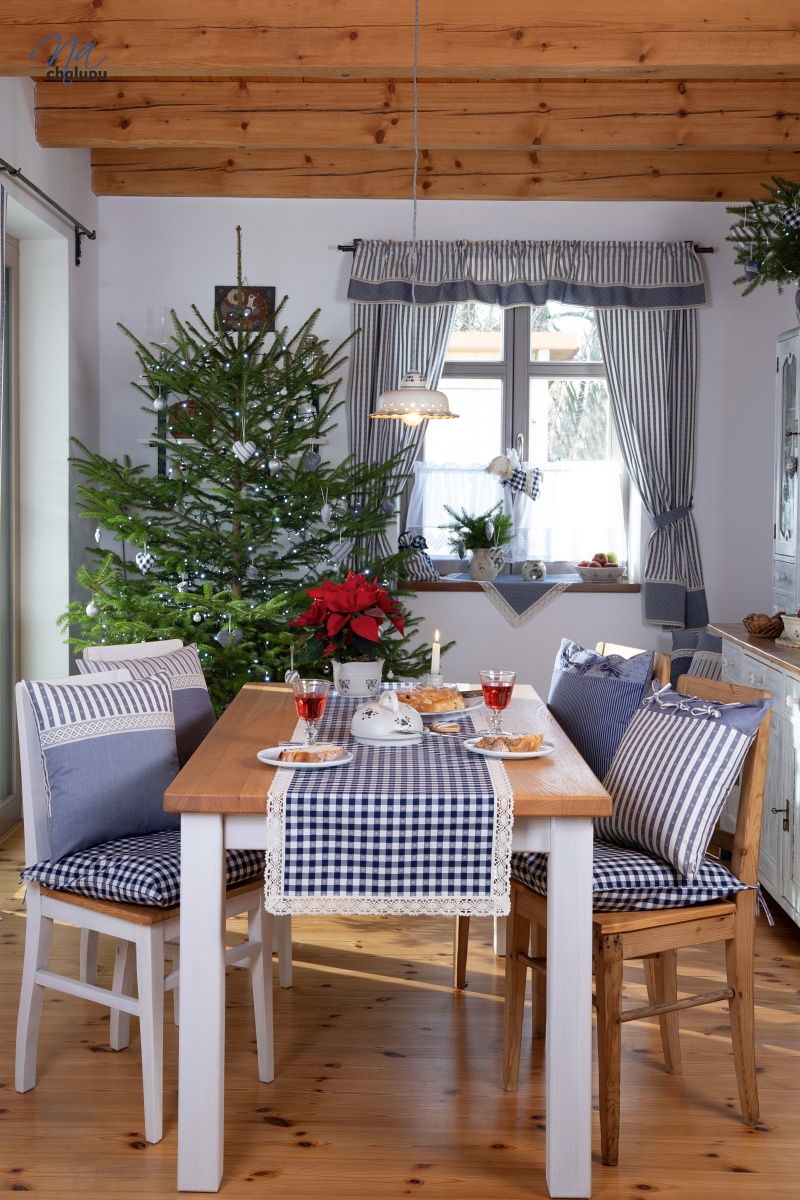 Kuchyň a jídelna jsou na chalupě místem setkávání. Modrý kanafasový ubrus, běhoun nebo prostírání dodá stolu venkovský charakter a pocit domova.