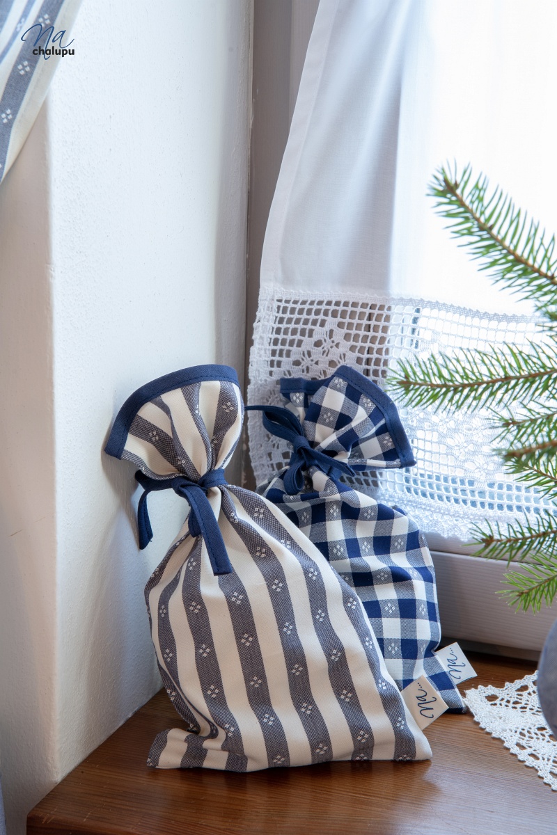Z modrého kanafasu šijeme také drobné dekorace – srdíčka, chňapky, pytlíky na pečivo nebo jiné praktické doplňky. Jsou to maličkosti, které dělají domov domovem.
